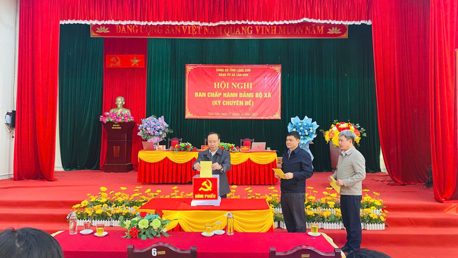 Ngày 17/12/2025, Đảng ủy xã Tân Văn tổ chức Hội nghị Ban Chấp hành Đảng bộ xã (kỳ chuyên đề) về công tác cán bộ và đánh giá, xếp loại chất lượng Đảng bộ xã năm 2025. Dự và chủ trì Hội nghị có các đồng chí Thường trực Đảng ủy.