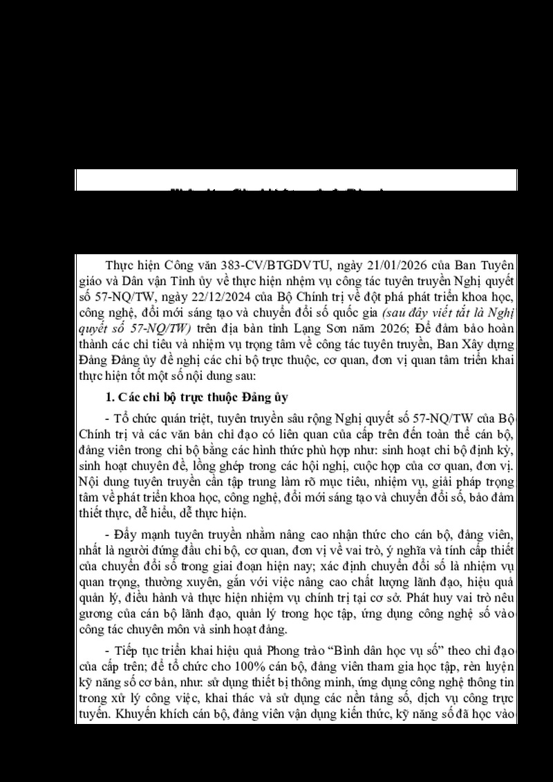 | Tiêu đề văn bản | Về việc thực hiện nhiệm vụ công tác tuyên truyền Nghị quyết số 57- NQ/TW, ngày 22/12/2024 của Bộ Chính trị năm 2026 | ||