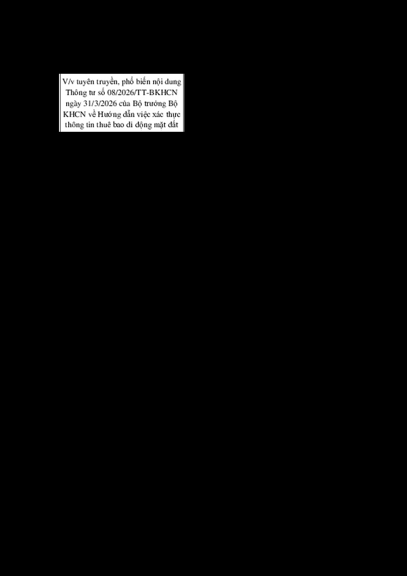 | Tiêu đề văn bản | Về việc tuyên truyền, phổ biến nội dung Thông tư số 08/2026/TT-BKHCN ngày 31/3/2026 của Bộ trưởng Bộ KHCN về Hướng dẫn việc xác thực thông tin thuê bao di động mặt đất | ||